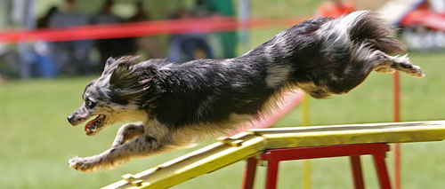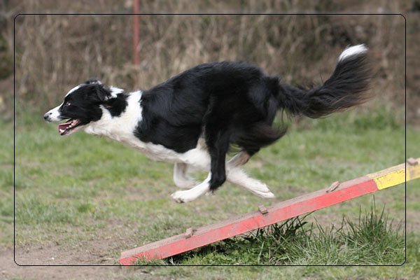 After about 5 sessions (maybe more for dogs, being retrained) of just running over the plank on the floor, set your plank on a very low object (maybe a book or a brick?) that will create a little bit of an angle. At this stage, run a dog over the plank in only one direction (from up down), ideally coming to the plank with good speed already (maybe send a dog around an object first or restrain him far enough from a plank), jumping on it and then running all the way down. Click the running at the end of a plank and still let the dog get the reward about 5 meters after a plank.