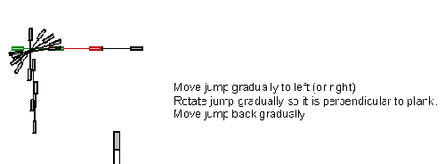 What I did was, basically, simply setting a jump after which there was her toy, somewhat to the left/right - very gradually of course. - No problems at the beginning, but as expected, her contacts did get worse at one point of putting a jump more and more to the side. We then finally agreed that that's not how we make contacts and the following angles all went real nice: I first moved a jump further to the left/right, then rotated a jump perpendicular to a plank and finally brought it closer. Something like this: