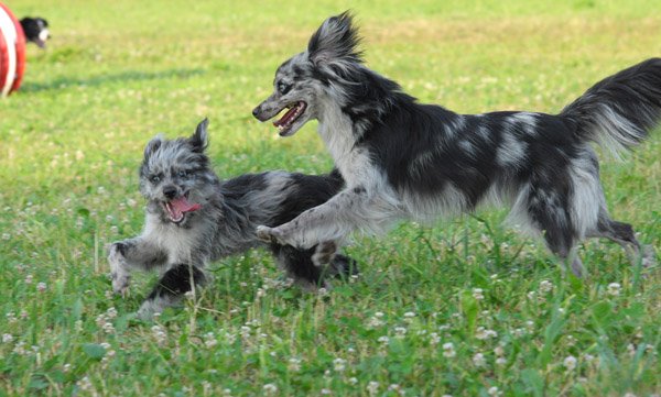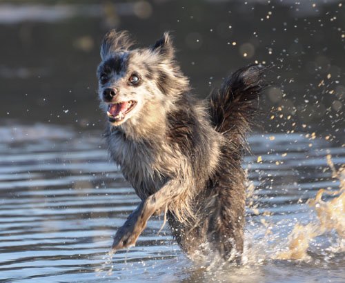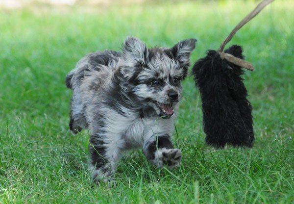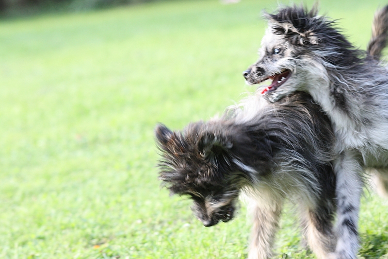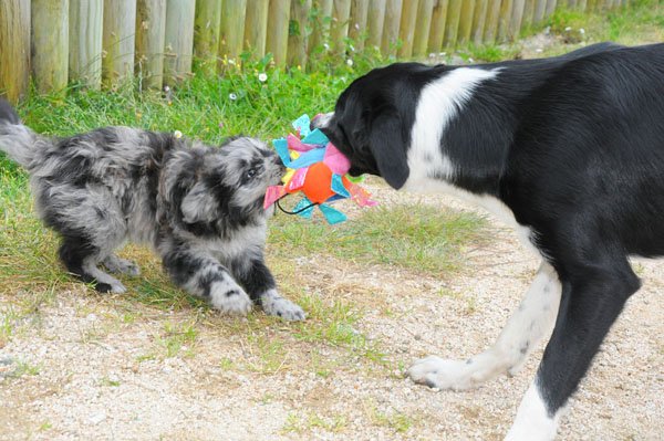 11.7. - Thanks to Valerie Teppe from France, here come some pictures of Le at 3 months. As you can see, she is becoming a real PyrShep, she is very enthusiastic about everything she does: playing, eating, working, smiling or sitting in a lap - and she still has moments when she acts exactly like on that video when she is 5 weeks. She should wear a dangerous dog sign! And YES, finally a PyrShep that swims!!! She looks like a little mouse and tries to climb on everybody's back, too cute! Have to make a video soon!